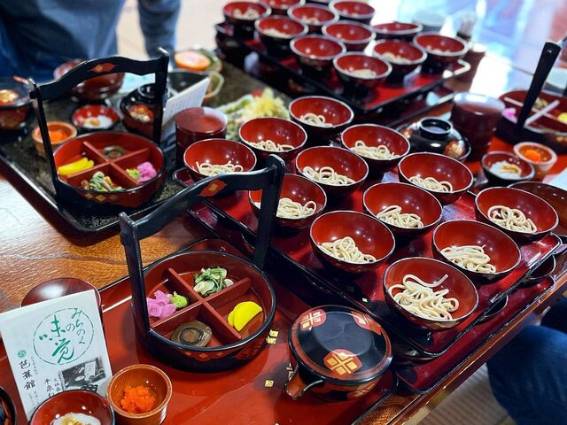 "Wanko soba" is a local dish where hot soba noodles are served in small bite-sized "wanko" (bowls) with condiments. The waiter puts bite-sized noodles dipped in hot soba broth into the bowl. The waiter adds more noodles to the empty bowl. This continues until you are full, and the basic style is to "eat all the noodles in the bowl and close the lid without leaving any leftover." The price is not based on a per bowl, but is usually a flat rate for all-you-can-eat. When you enter the restaurant, you are shown to a large room where you are often made to wait for a while until other customers arrive. This is because they place importance on the traditional style of eating in large groups.