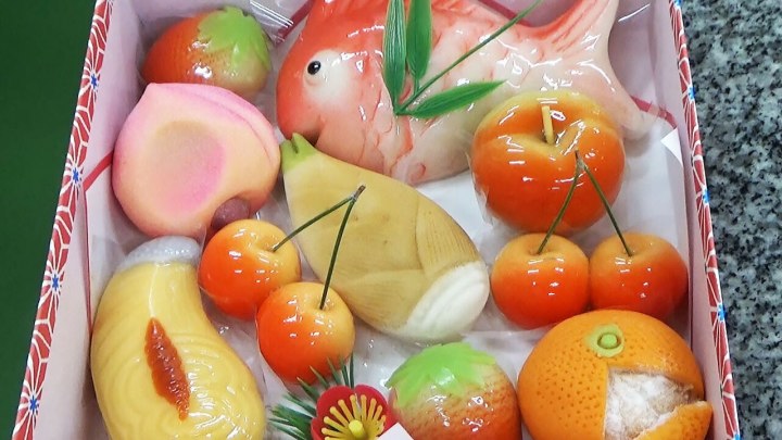 create unique Hina sweets in the form of colorful vegetables, fruits, fish,
